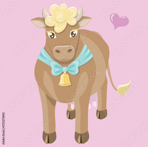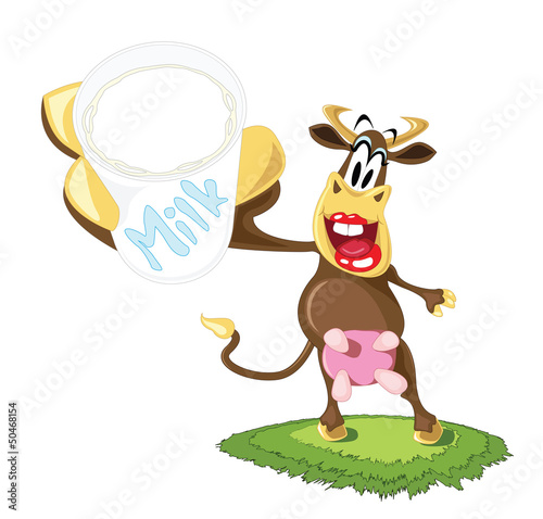 Cow holding milk tetra pack box vector. Funny happy smile farm animal cartoon mascot character with fresh dairy drink isolated on white background