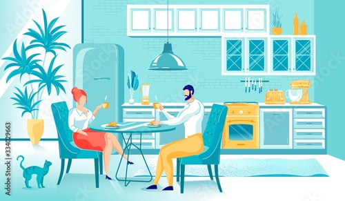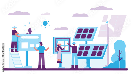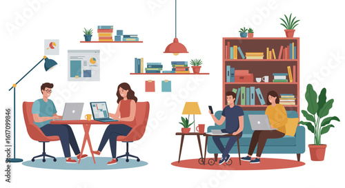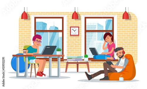 Coworking center concept vector illustration. Coworking team. People making use of laptops, tablet, headset and headphones. Flat style design.