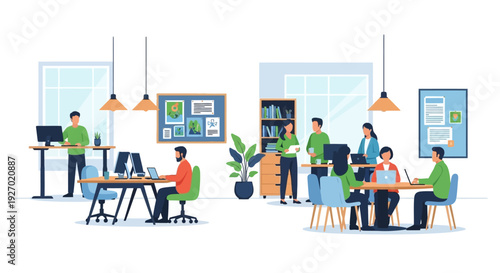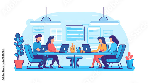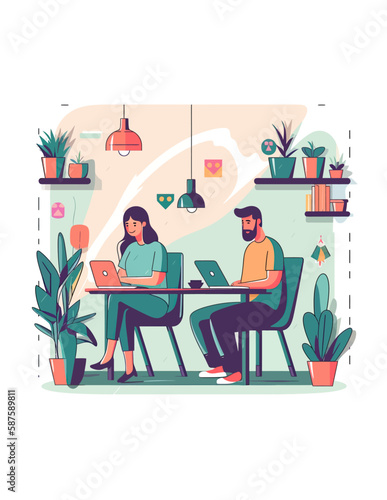 Coworking center concept vector illustration in flat style. Coworking team. Young men and woman making use of laptops and smart phone.