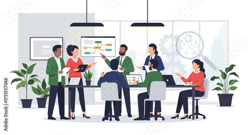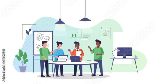 Coworking space scene set, flat vector isolated illustration. Business office center for freelancers, remote teams. People talking, working, drinking coffee, holding meeting sharing open common space.