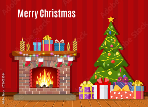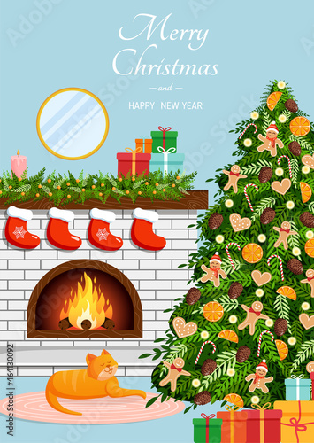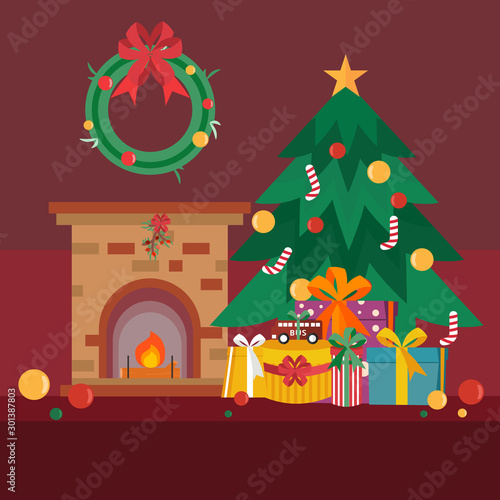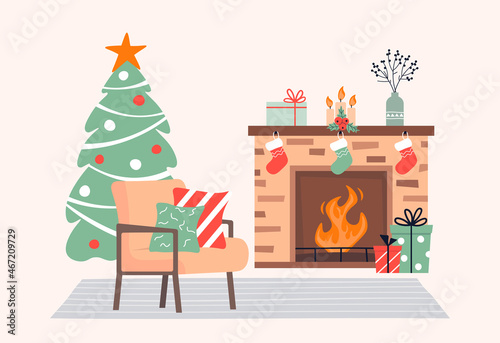 Cozy living room interior with decorated Christmas tree, fireplace, gifts, flat vector illustration. Home decoration for Christmas, New Year winter holidays celebration.