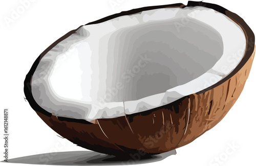Cracked coconut shell in milkshake splash realistic vector icon. Design element for sweet products isolated on white background