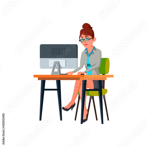 Vector illustration of graphic designer female sitting at the table and working on tablet. Creative team people flat style design element, icon isolated on white background.