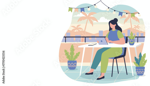 Creativity crisis. Sad, confused, tired woman, writer sitting at desk with clean sheet of paper on it, flat vector illustration. Creative crisis and burnout, depression, mental stress.