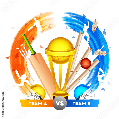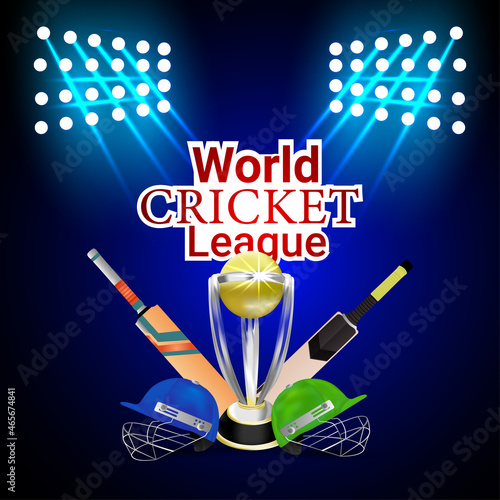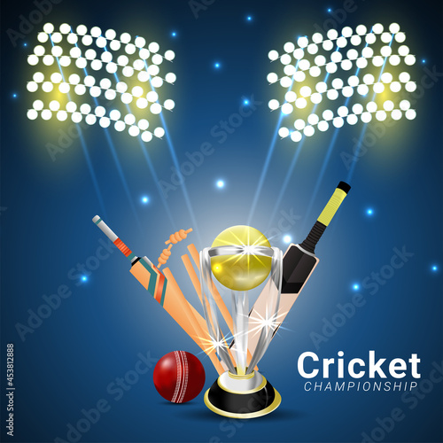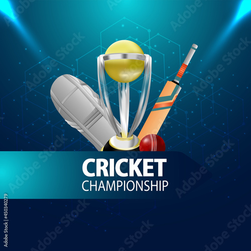 Cricket championship event vector poster, banner design template. Cricket game equipment and protective gear. Realistic bat, helmet, batting leg guards or pads, ball, stump, winner cup and text.