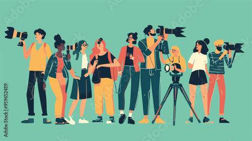 Crowd of journalists and reporters with microphones and cameras for video and photo shooting vector illustration. Press conference concept