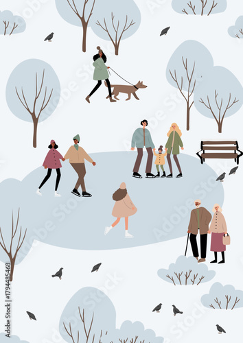 Crowd of people spending time in winter park vector illustration. Couple, parent with children characters walking, making snowman, carrying Christmas fir tree, ice skating together