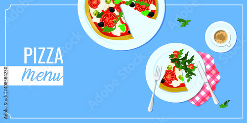 Culinary tourism vector poster, banner template. Paper cut plane flying out of big delicious italian pizza. Gastronomic tour. Travel food experience. Italian traditional food. World culinary tours.