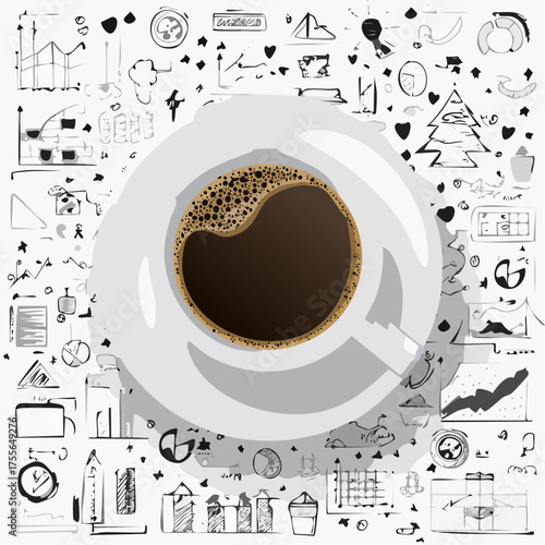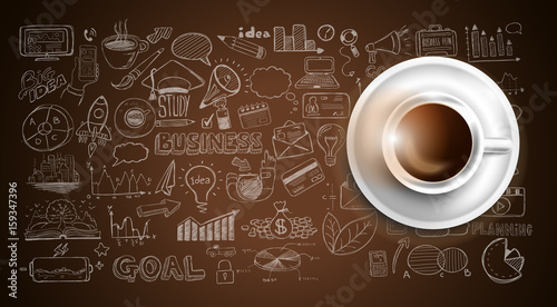 Vector realistic top view cup of black tea with hand drawn doodle tea items around it on wood background. Sketch vintage tea set.