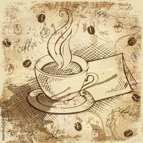 Vector realistic top view cup of black tea with hand drawn doodle tea items around it. Sketch vintage tea set.
