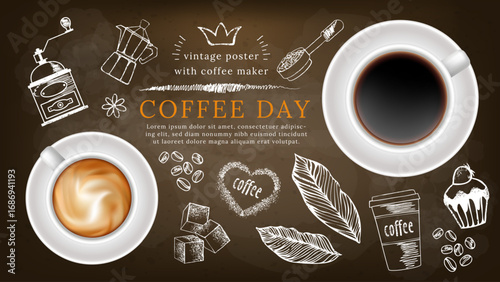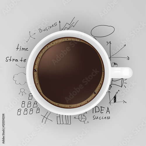 Vector realistic top view cup of coffee with hand drawn doodle coffee drinks around it. Sketch vintage coffee background.