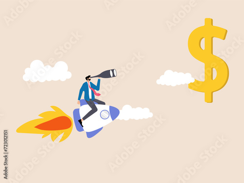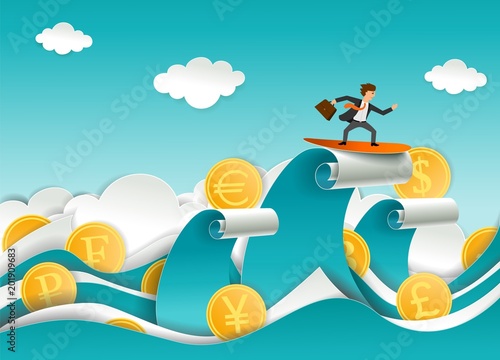 Successful businessman surfing reserve currency wave. Vector illustration in paper art style. Modern origami design template.