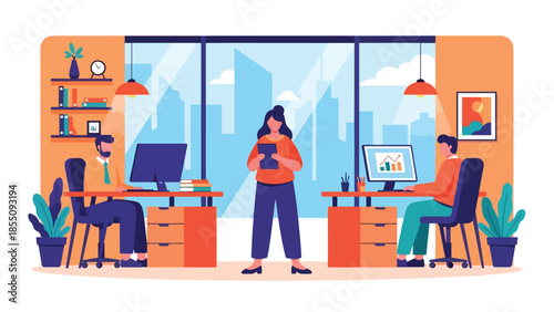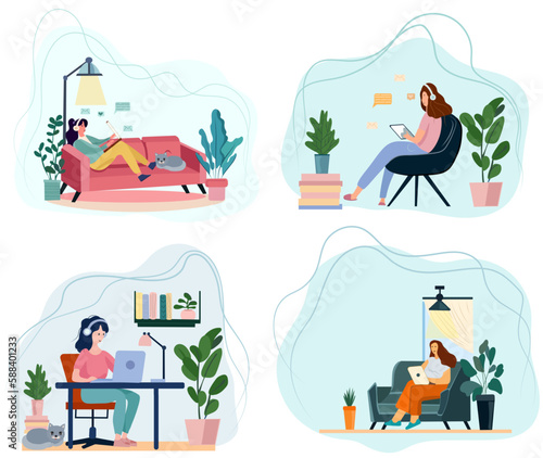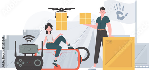 Customer waiting for her car in auto mechanic shop. Car repair service cartoon vector illustration. Mechanic engineer fix broken car and change tires and oil. Vehicle maintenance station.