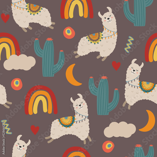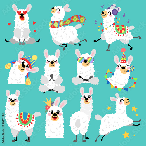 Cute cartoon alpaca icon set. Vector hand drawn illustration of funny pink, yellow, blue llamas and cactuses for greeting card, invitation, baby shower card, poster, patch, sticker and print.