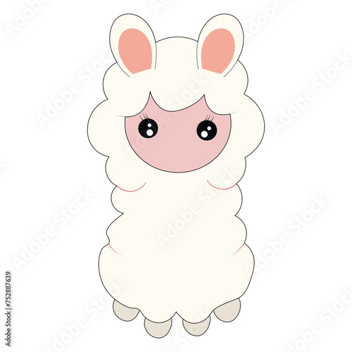 Cute alpaca vector. Funny lama sitting cartoon icon. Kawaii animal illustration. Happy smiling mascot with fluffy curly pink wool isolated on white backgroun