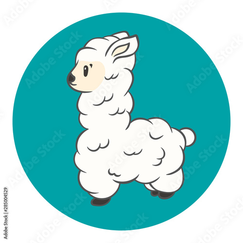 Cute alpaca vector. Funny lama standing cartoon icon. Side view kawaii animal smiling illustration. Happy mascot with fluffy curly green wool isolated on white background