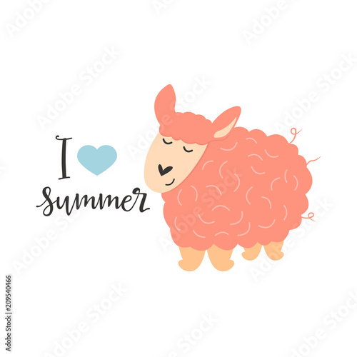 Cute alpaca vector. Funny lama standing cartoon icon. Side view kawaii animal smiling illustration. Happy mascot with fluffy curly yellow wool isolated on white background