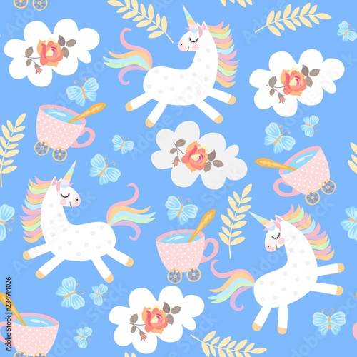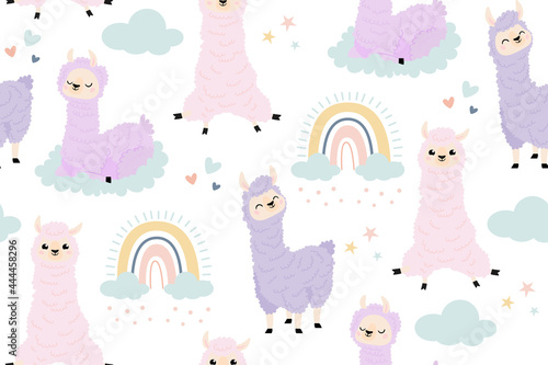 Cute alpacas with cactuses and mountains vector seamless pattern. Creative design for fabric, textile, wallpaper, wrapping paper.