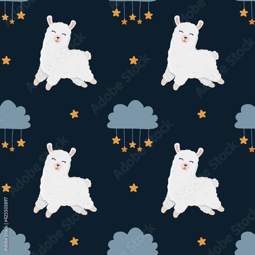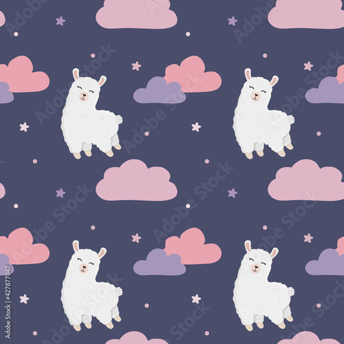 Cute white alpacas with white and pink balls of wool vector seamless pattern. Creative design for fabric, textile, wallpaper, wrapping paper.