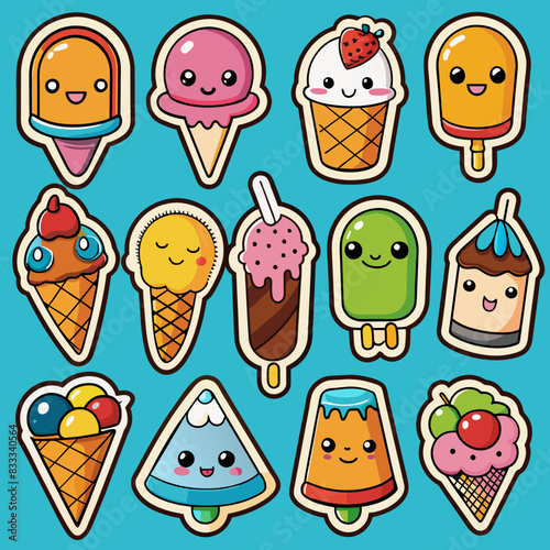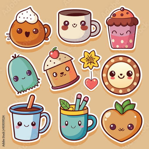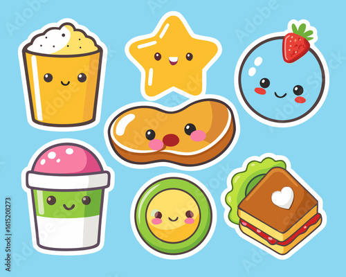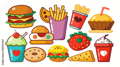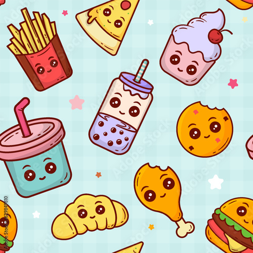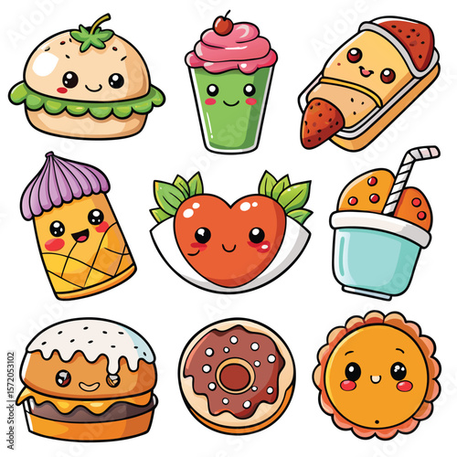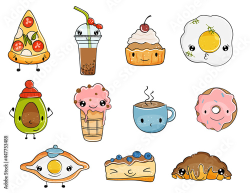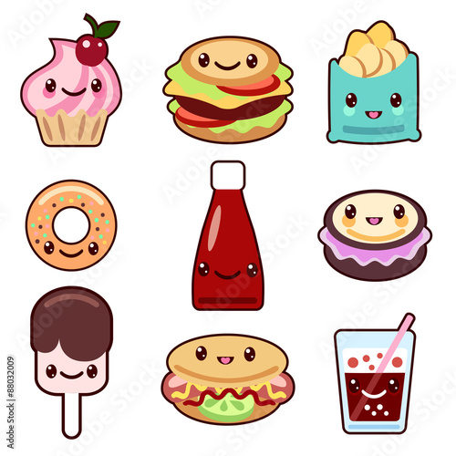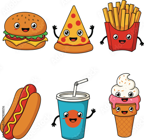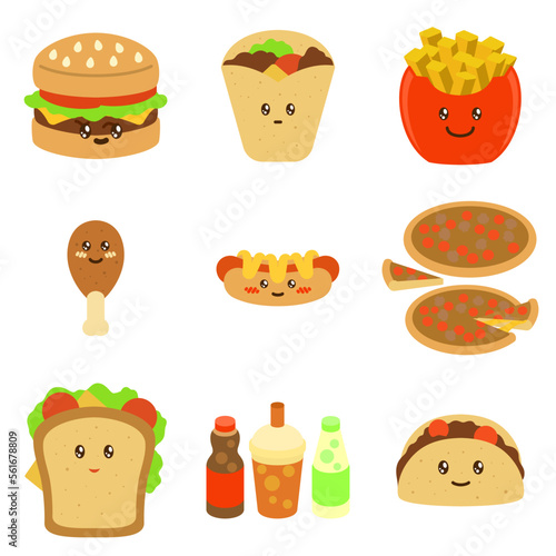 Cute funny fast food character set, flat vector illustration. Happy cartoon burger, shawarma, french fries, coffee, hot dog, pizza, chicken legs, popcorn, wok, ice cream cone with human faces.