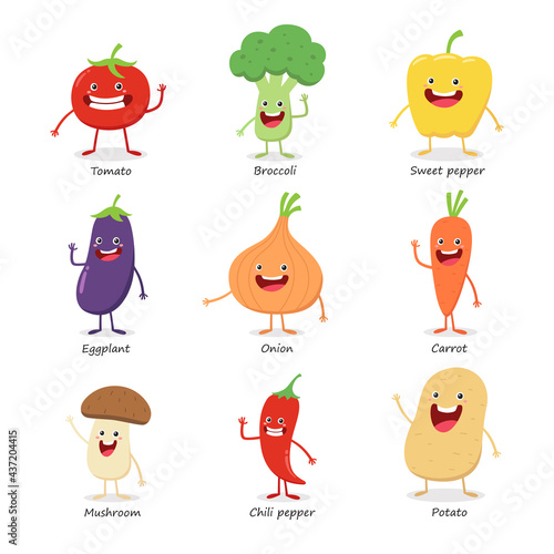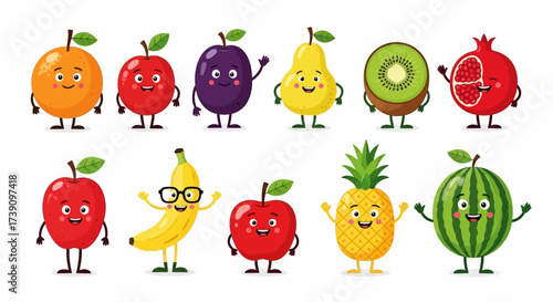 Cute and funny fruit character set, flat vector illustration. Summer fruits and berries. Happy cartoon cherry, watermelon, plum, banana, apple, lemon, pear, strawberry, avocado, pineapple with faces.