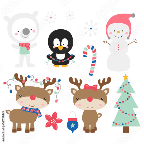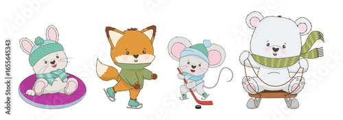 Cute animals in warm hats and scarves enjoying ice skating. Vector illustration isolated on white background. Funny little raccoon fox squirrel bear owl deer and rabbit having fun in winter.