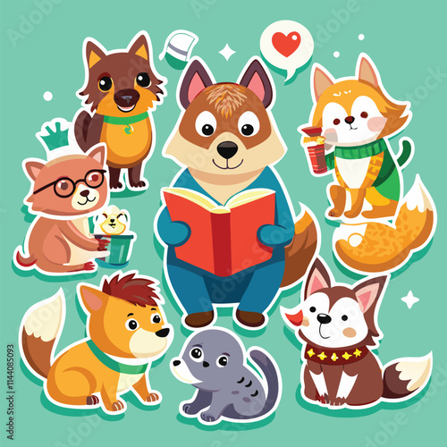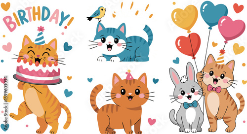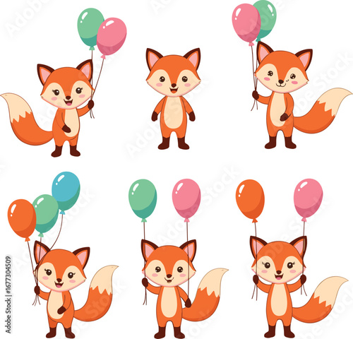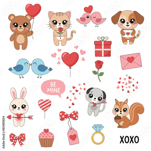 Cute animals in love vector illustration isolated on white background. Happy fox, bear, owl, raccoon, squirrel, deer, hedgehog and hare holding hearts, cake, balloons and flowers.