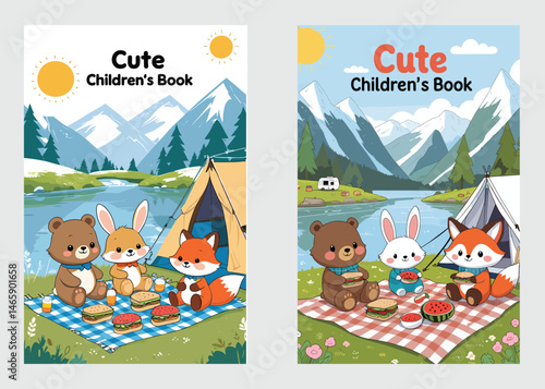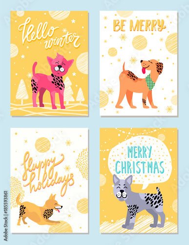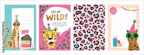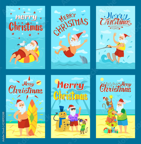 Vector set of cards with wild animals taking rest on beach and handwritten summer quotations. Vector illustration of funny hedgehog squirrel owl raccoon rabbit and panda enjoying summer beach holidays