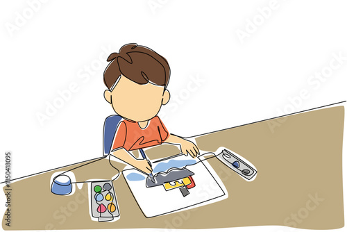 Cute boy making robot, studying robotics at robot school for children, flat vector illustration. Kids robotics engineering.