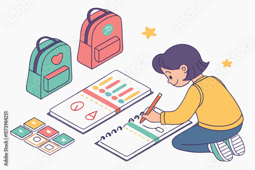 Cute boy making robot, studying robotics at robot school for children, flat vector illustration. Kids robotics engineering.