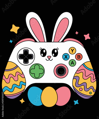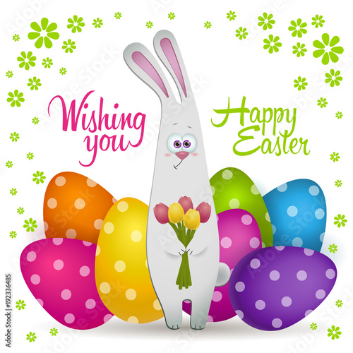 Cute bunny with Easter eggs, flowers, vector illustration in paper art craft style. Happy Easter greeting card design template.
