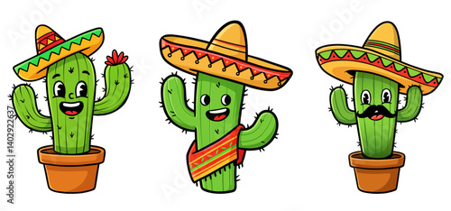 Cute cactus vector illustration. Cartoon garden flower plant set. Happy funny kawaii succulent character isolated on white background. Doodle flowerpot design. Tropical smiling emoji