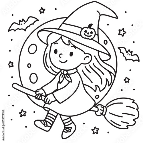 Cute happy cartoon Halloween witch fantasy character wearing costume flying on broomstick over full moon in sky vector illustration. Magic hallows eve in autumn season