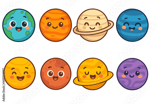 Cute cartoon Solar system planets. Paper cut Uranus Neptune Mercury Venus Mars Jupiter Saturn Earth Sun Moon with smiling faces, vector illustration. Funny childish space planet emoji. Kids astronomy.