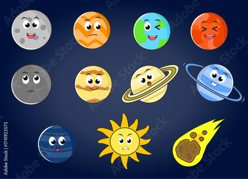 Cute cartoon Solar system planets. Paper cut Uranus Neptune Mercury Venus Mars Jupiter Saturn Earth Sun Moon with smiling faces, vector illustration. Funny childish space planet emoji. Kids astronomy.
