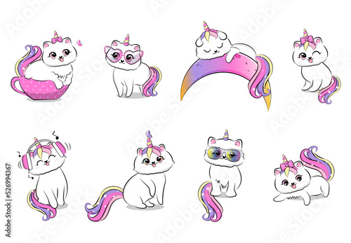Cute cats in love. Vector illustration isolated on white background. Happy hugging, playing, holding hearts loving kittens for greeting card, invitation, poster, sticker, print.