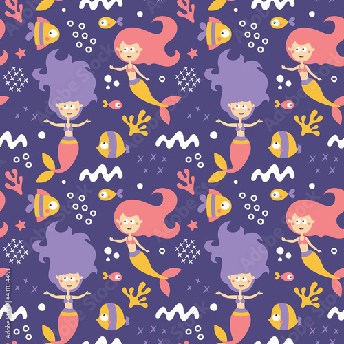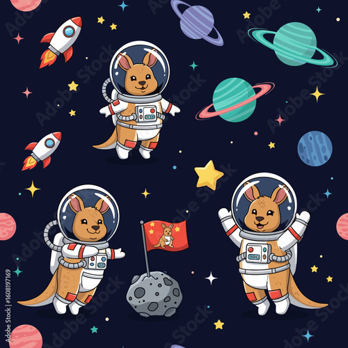 Cute cats in outer space vector seamless pattern. Creative design for fabric, textile, wallpaper, wrapping paper.