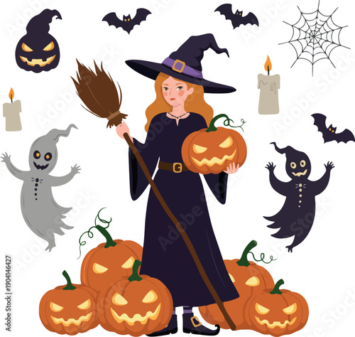 Cute charmed little witch with pumpkin and bats vector illustration. Happy Halloween autumn carnival party celebration concept
