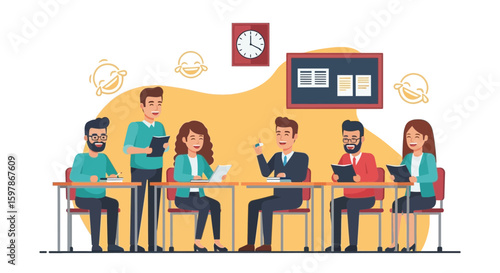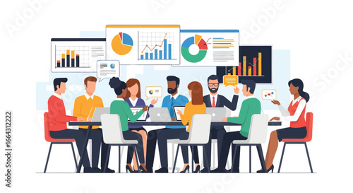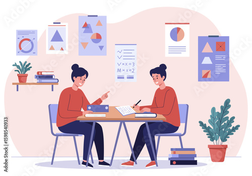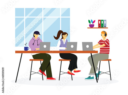 Cute couple drinking coffee and talking to each other while sitting at table in cafe, vector flat style design illustration. Young people visiting cafe. Happy romantic couple in love having date.