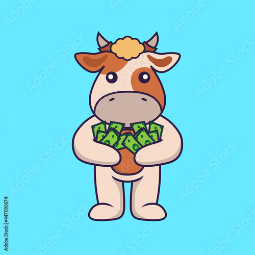 Cute cow animal character holding glass bottle with farm milk flat cartoon vector illustration. Funny mascot advertising fresh natural dairy product