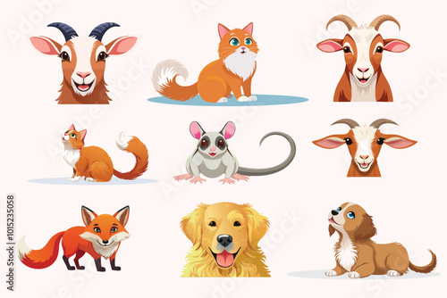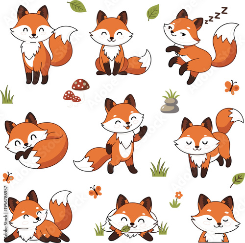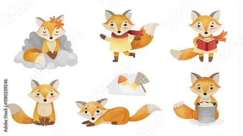 Cute fox icon set for greeting card, invitation, poster, sticker, print. Vector isolated illustration of funny foxes sitting sleeping, jumping, flying, dreaming, being in love, listening to music.