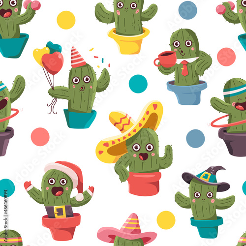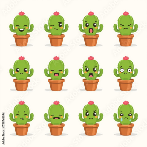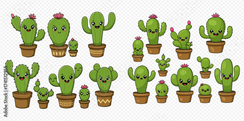 Cute cartoon cacti icon set. Vector illustration isolated on white background. Blooming cactuses with funny faces in pots for greeting card, invitation, poster, sticker, print.