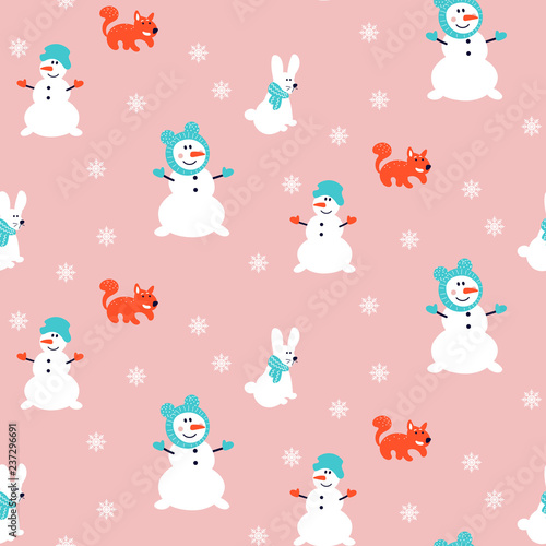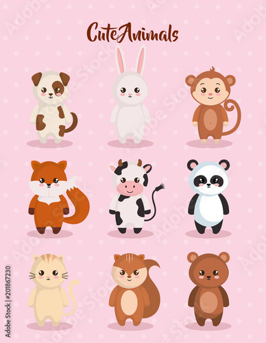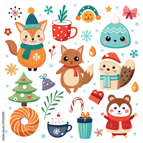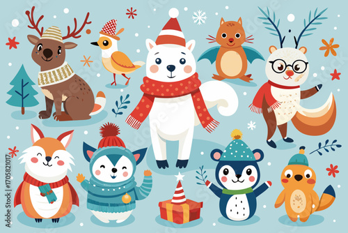 Christmas animals. Vector illustration isolated on white background. Cute raccoon hedgehog deer owl rabbit fox squirrel and bear with christmas decorations for greeting card, sticker, print.
