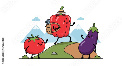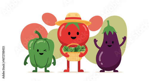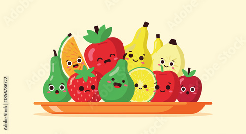 Cute funny fruit characters in salad bowl, flat vector illustration. Happy cartoon cherry, watermelon, plum, banana, apple, lemon, pear, strawberry, avocado, pineapple with faces. Fresh organic food.