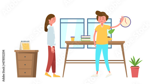 Cute girl washing dishes while standing on chair in kitchen, flat vector illustration. Kid helping her mother do household chores. House cleaning, housekeeping.