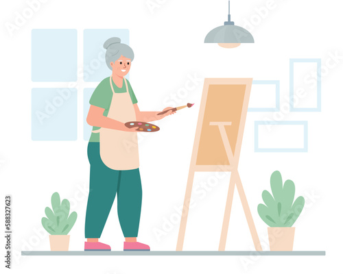 Cute girl washing dishes while standing on chair in kitchen, flat vector illustration. Kid helping her mother do household chores. House cleaning, housekeeping.