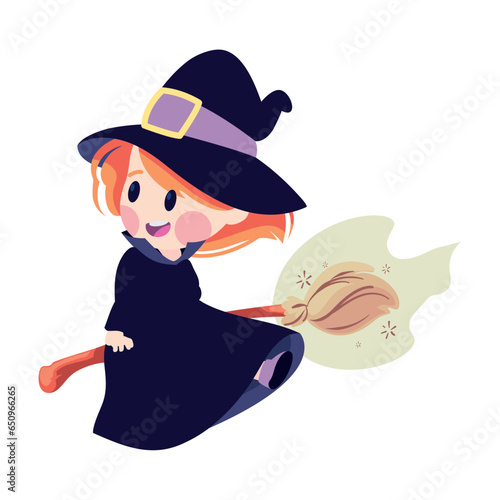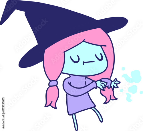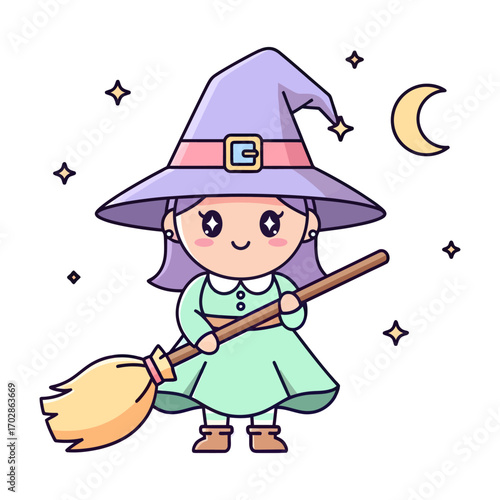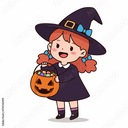 Halloween witch girl vector in witchcraft hat and costume dress illustration icon isolated on white background. Cute child wizard sorcerer carrying poisonous potion flask. Autumn party celebration concept