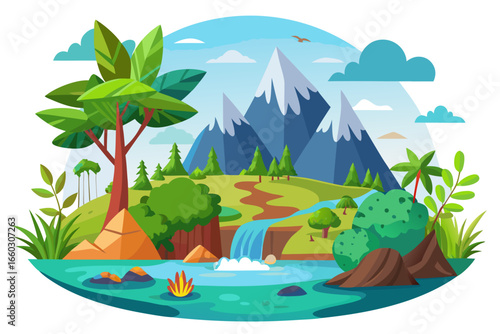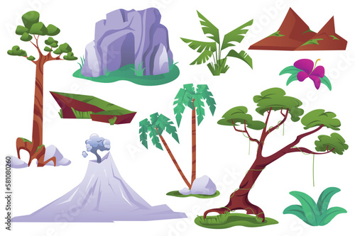 Cute jurassic dino cartoon character set, prehistoric nature, volcanoes, flat vector isolated illustration. Dinosaur era.