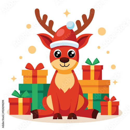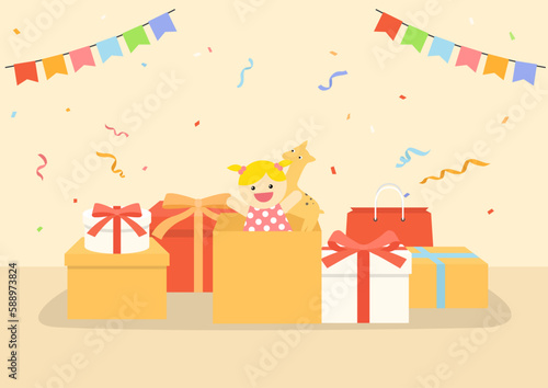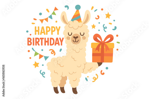 Cute lama alpaca animal birthday celebration flat vector icon. Funny llama character sitting near gift boxes and smiling cartoon illustration isolated on white background