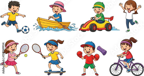 Cute little witches riding broomstick, preparing potion in boiling cauldron etc. Vector illustration isolated on white background. Halloween witches for party invitation, poster, sticker, print.
